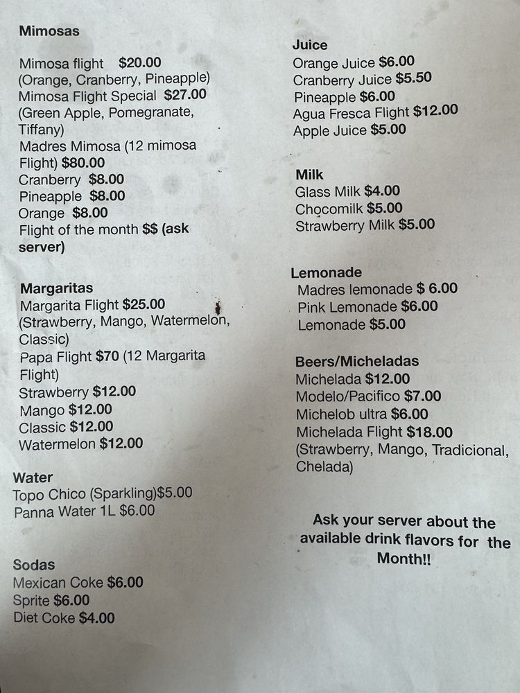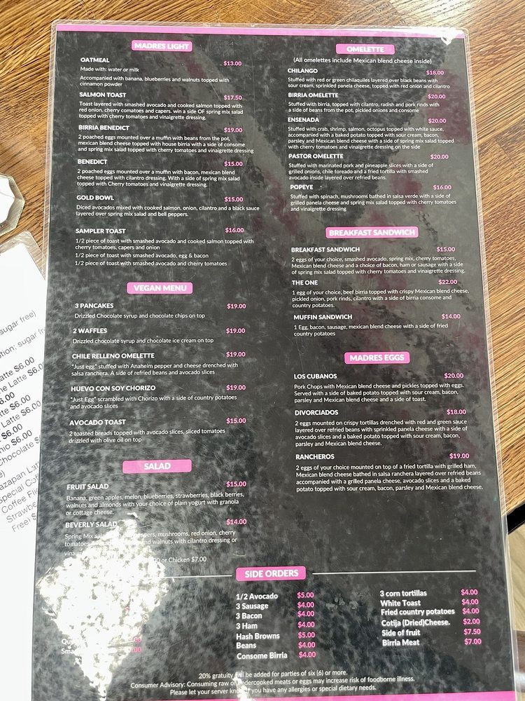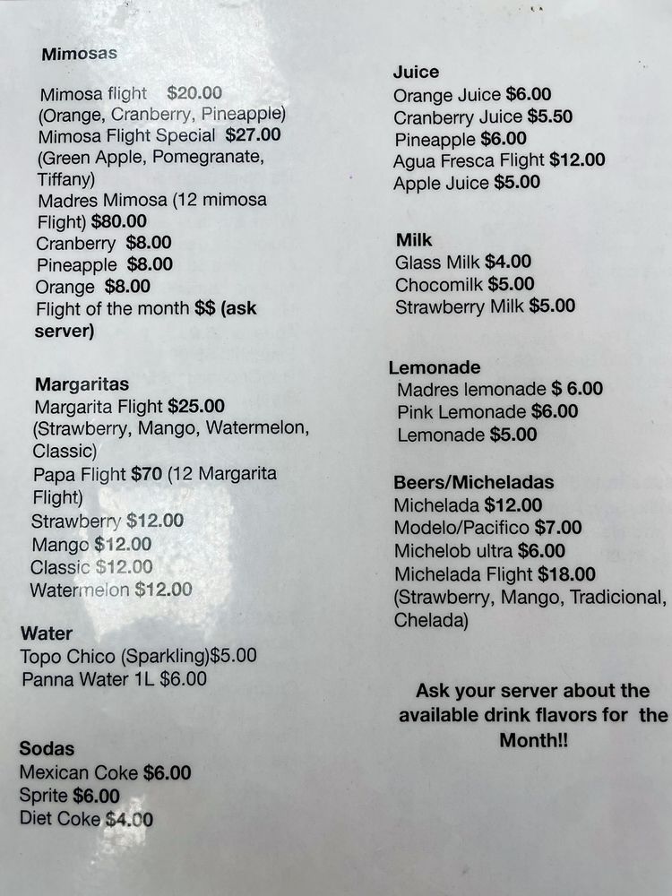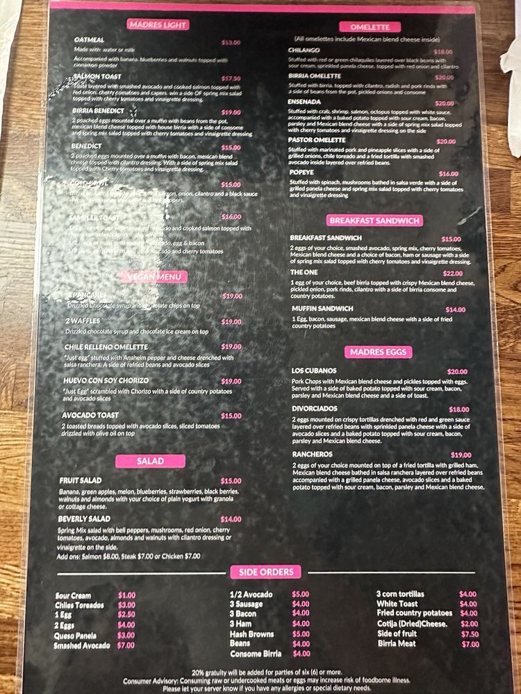 Madres Brunch, located in Whittier, CA, is a trendy and casual spot offering a diverse menu for breakfast and brunch. With vegan options available, this restaurant caters to a variety of dietary preferences. The establishment is wheelchair accessible, with ADA-compliant features, ensuring inclusivity for all guests. There are no steps or stairs to navigate within the premises, enhancing ease of access. Customers can enjoy their meal in the outdoor seating area or opt for takeout or delivery services. The menu showcases a mix of traditional and innovative dishes, perfect for groups or families. With waiter service and free Wi-Fi, guests can relax and savor their meal in a welcoming ambiance. Madres Brunch also features Happy Hour specials, making it a great choice for a leisurely meal or gathering.